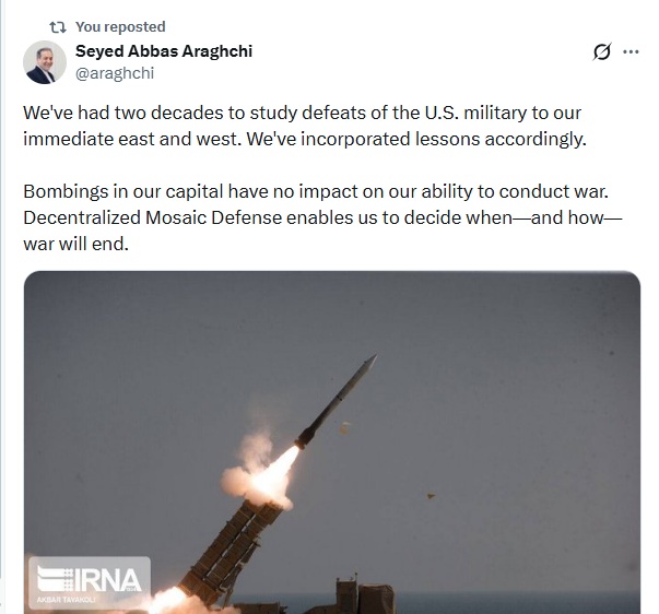 Seyed Abbas Araghchi:  La Defensa Mosaico descentralizada nos permite decidir cuándo —y cómo— terminará la guerra.