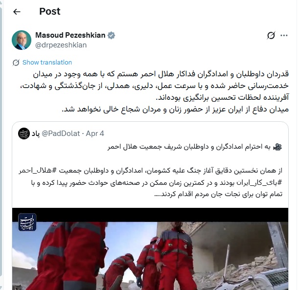 Dr.Pezeshkian: Estoy agradecido con los voluntarios y rescatistas abnegados de la Media Luna Roja