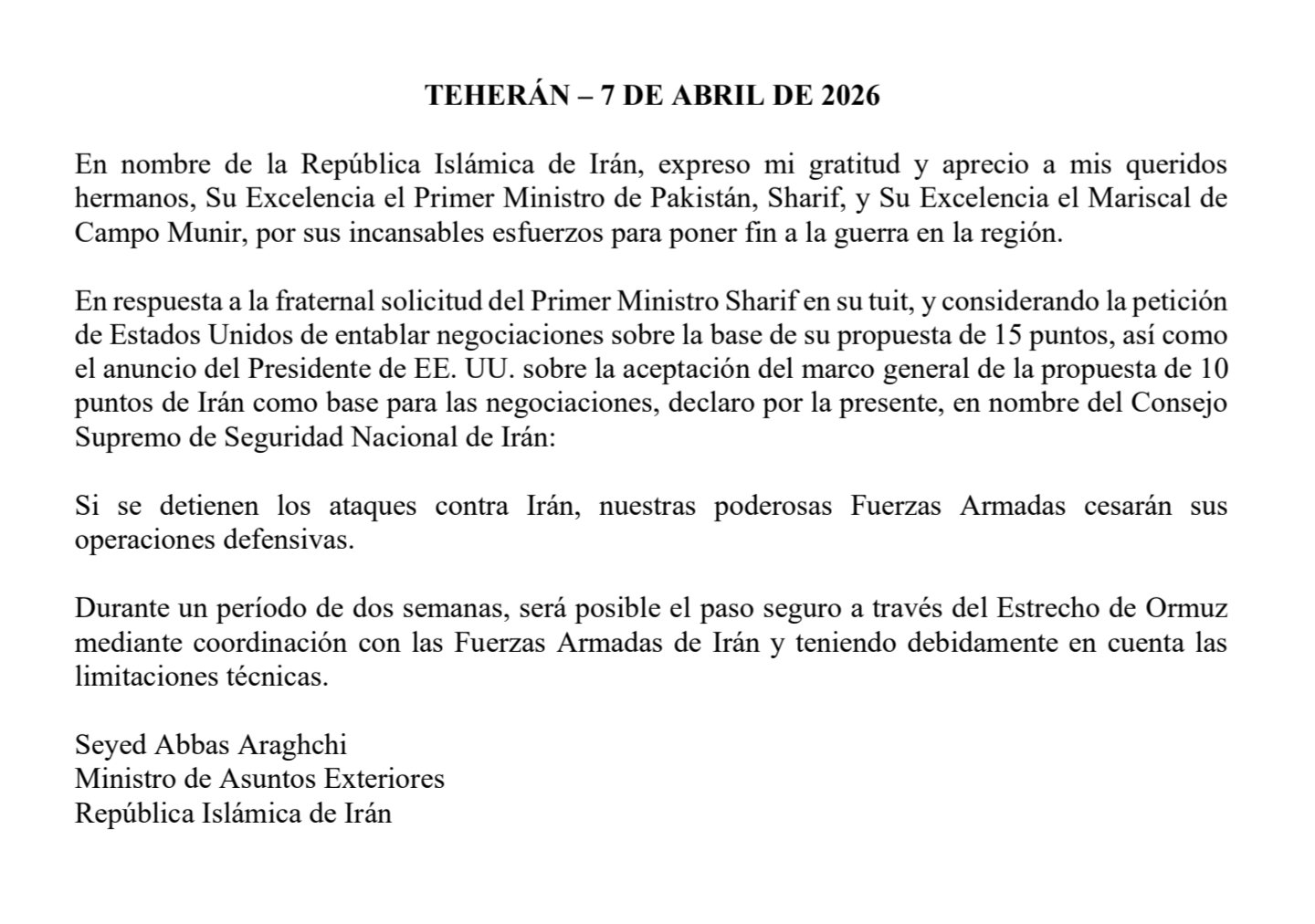 En respuesta a la fraternal solicitud del Primer Ministro Sharif en su tuit, y considerando la petición de Estados Unidos de entablar negociaciones sobre la base de su propuesta de 15 puntos, así como el anuncio del Presidente de EE. UU. sobre la aceptación del marco general de la propuesta de 10 puntos de Irán como base para las negociaciones, declaro por la presente, en nombre del Consejo Supremo de Seguridad Nacional de Irán: