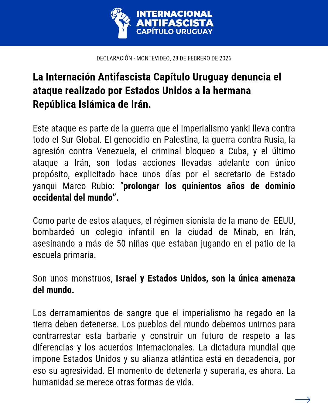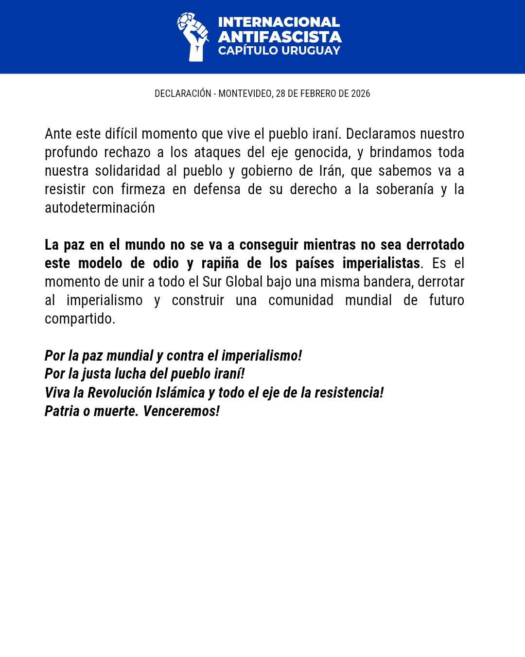 "گروه بین‌الملل ضد فاشیسم - شاخه اروگوئه" حمله انجام شده توسط ایالات متحده به کشور برادر، جمهوری اسلامی ایران را محکوم می‌کند.
